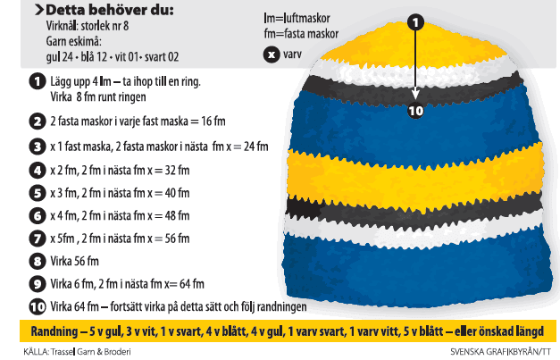 Varv 7: 1 lm, 1 fm i varje st, virka (2 fm, 2 lm, 2 fm) i varje hörn. Slut med 1 sm i första fm.